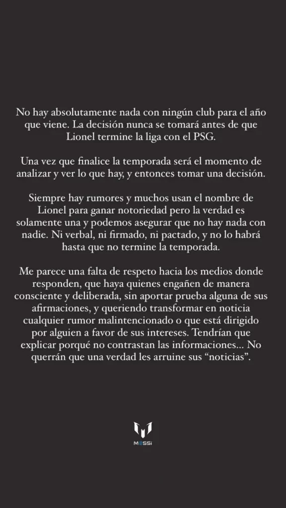 Asimismo, el mensaje también condena las versiones surgidas desde Francia que indicaban un acuerdo total con Al Hilal: “Siempre hay rumores y muchos usan el nombre de Lionel para ganar notoriedad pero la verdad es solamente una y podemos asegurar que no hay nada con nadie. Ni verbal, ni firmado, ni pactado y no lo habrá hasta que no termine la temporada. Me parece una falta de respeto hacia los medios donde responden, que haya quienes engañen de manera consciente y deliberada, sin aportar prueba alguna de sus afirmaciones y queriendo transformar en noticia cualquier rumor malintencionado o que está dirigido por alguien a favor de sus intereses. Tendrían que explicar porqué no contrastan las informaciones… No querrán que una verdad les arruine sus ‘noticias’“.