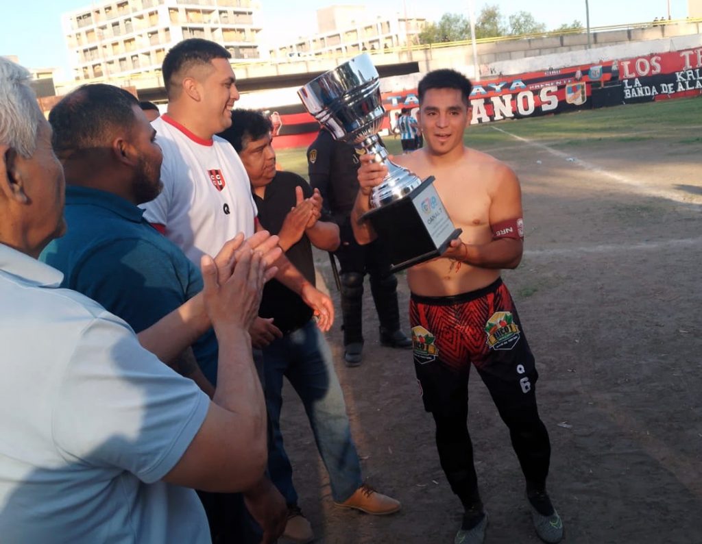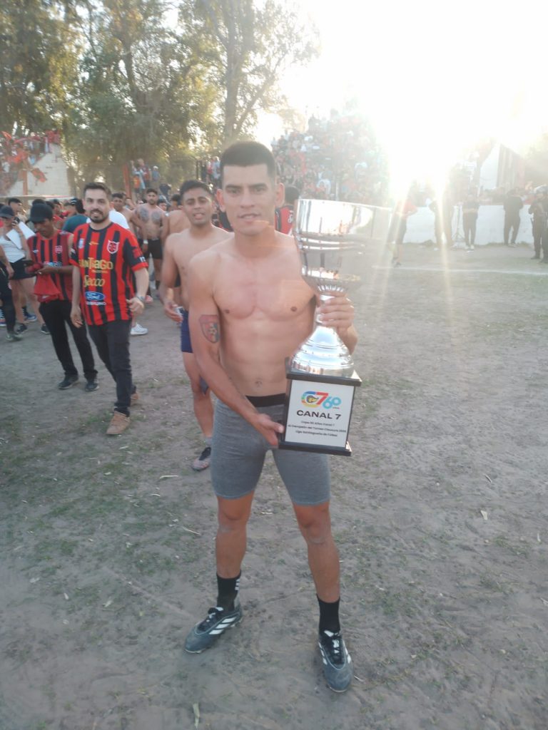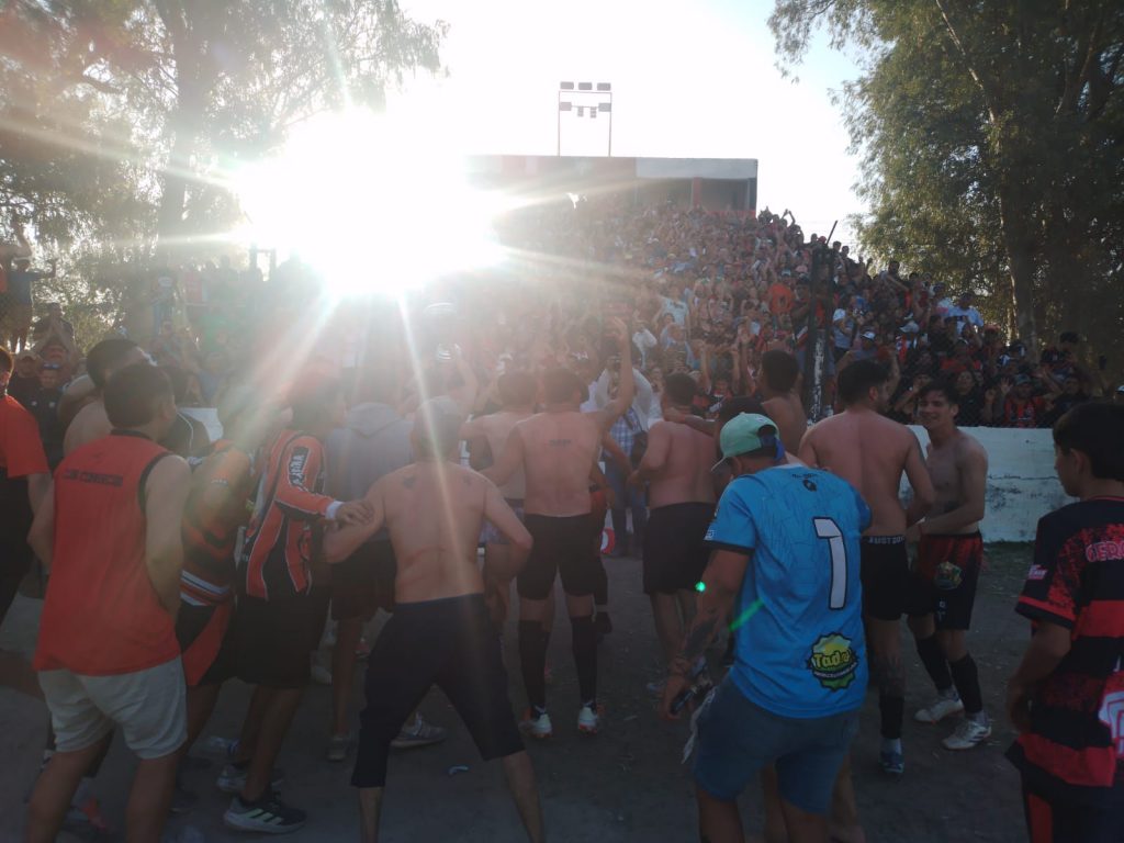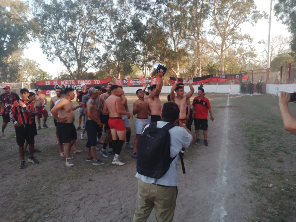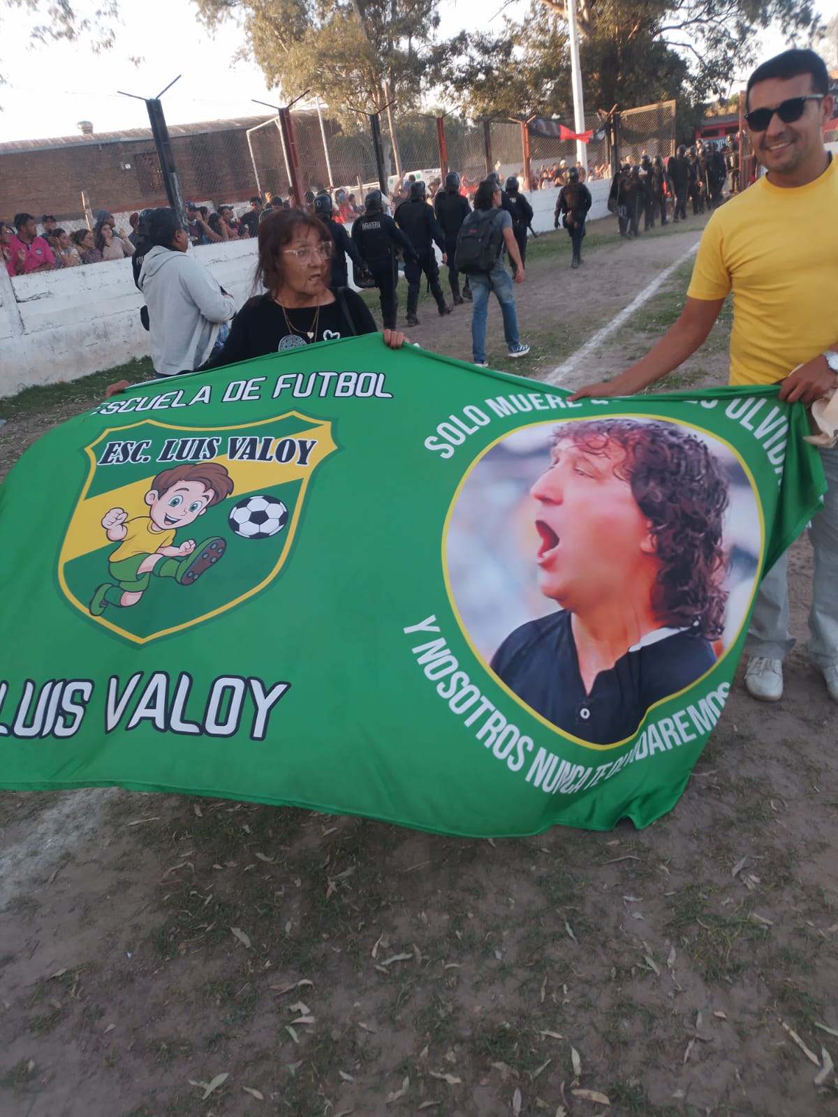 Doña Nelda Alderete de Valoy, esposa del recordado Luis Ámerico “Loco” Valoy, figura histórica fútbol santiagueño y madre del DT campeón de Comercio Central Unidos, Jorge Valoy, vivió la fiesta “tripera” como una hincha más. Antes de que sgosports.com.ar la retrara en su foto, sacó la bandera de la escuelita de fútbol “Luis Valoy” para hacer recordar al gran “Loco”. Junto a Nelda estuvo Darío Valoy, el otro hijo del extinto ídolo.