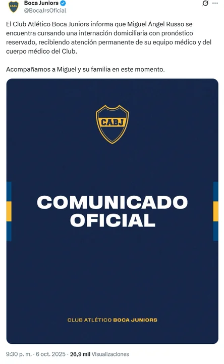 “El Club Atlético Boca Juniors informa que Miguel Ángel Russo se encuentra cursando una internación domiciliaria con pronóstico reservado, recibiendo atención permanente de su equipo médico y del cuerpo médico del Club”, detalla el escueto pero alarmante mensaje publicado en las redes sociales de la institución.