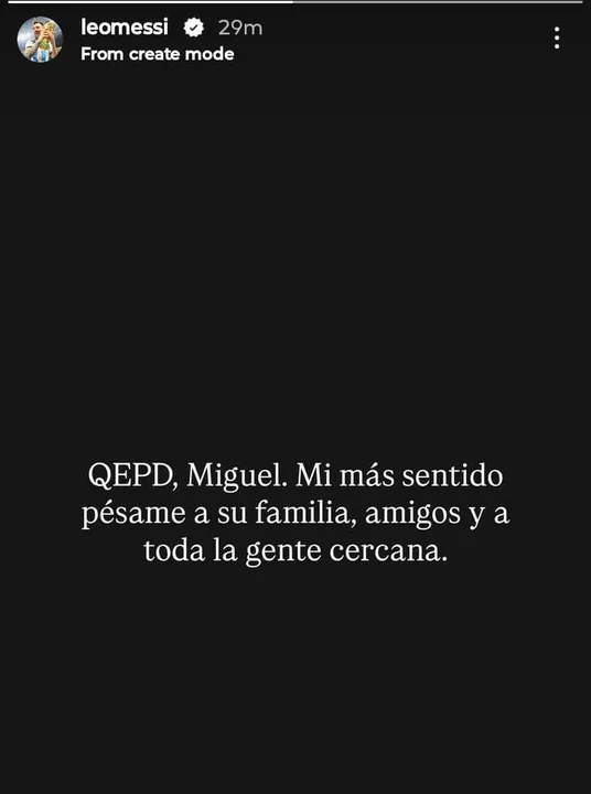 “QEPD, Miguel. Mi más sentido pésame a su familia, amigos y a toda la gente cercana”, escribió el astro argentino en una historia de su cuenta personal de Instagram.