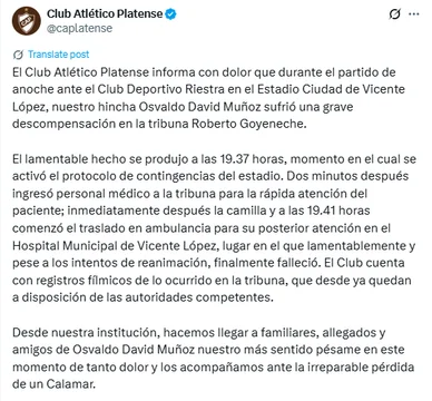 En el comunicado, Platense expresó sus condolencias a la familia, allegados y amigos del fallecido, a quienes acompañó en el dolor por la pérdida.