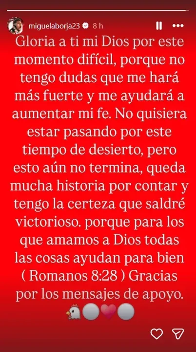 Y agregó: “No quisiera estar pasando por este tiempo de desierto, pero esto aún no termina, queda mucha historia por contar y tengo la certeza que saldré victorioso. Porque para los que amamos a Dios todas las cosas ayudan para bien (Romanos 8:28). Gracias por los mensajes de apoyo”.