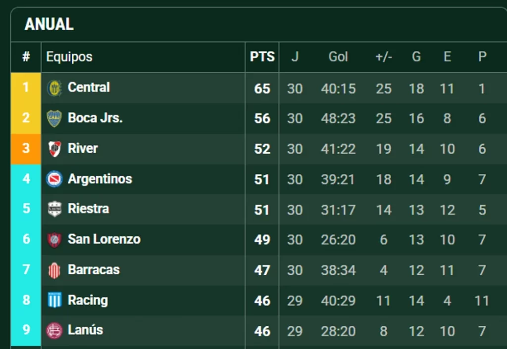 - Rosario Central, que con 65 puntos ya se aseguró su lugar por la tabla anual.