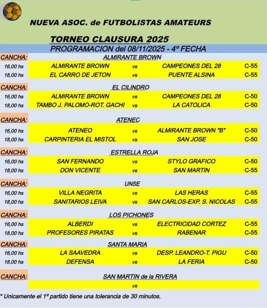 Este sábado se disputará la 4ta fecha del torneo Clausura que organiza la Nueva Asociación de Futbolistas Amateurs en sus dos categorías con la siguiente programación: