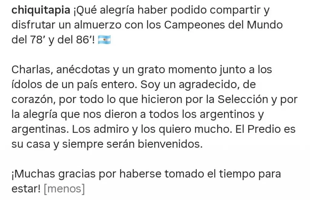 “Charlas, anécdotas y un grato momento junto a los ídolos de un país entero. Soy un agradecido, de corazón, por todo lo que hicieron por la Selección y por la alegría que nos dieron a todos los argentinos y argentinas. Los admiro mucho. El Predio es su casa y siempre serán bienvenidos. Muchas gracias por haberse tomado el tiempo para estar”, manifestó el “Chiqui” Tapia en la descripción de su publicación de Instagram.