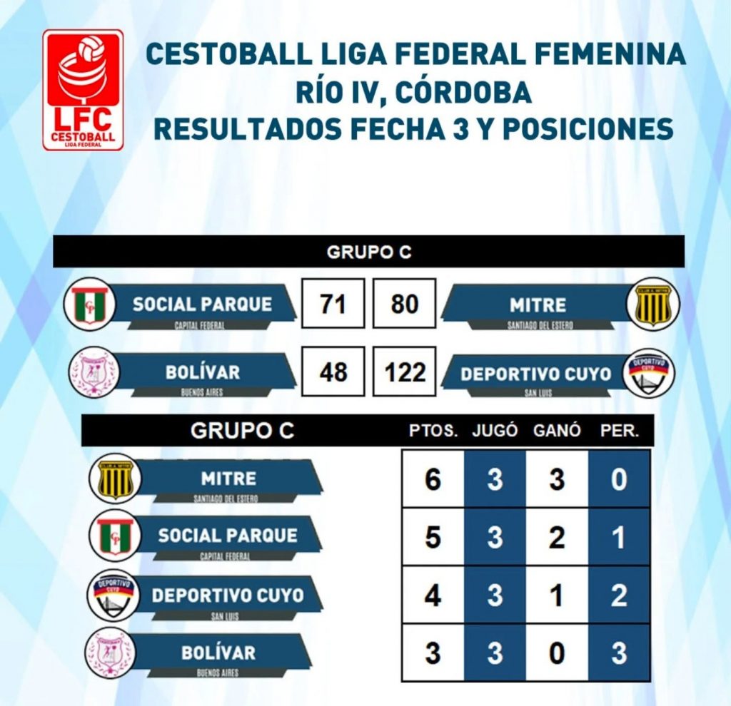 Mitre Cesto pasó a cuartos de final de la Liga Federal de cestoball que se está desarrollando en la ciudad cordobesa de Río Cuarto, tras vencer a Cuyo a Bolívar y este jueves a Social Parque con un marcador de 80 a 71.