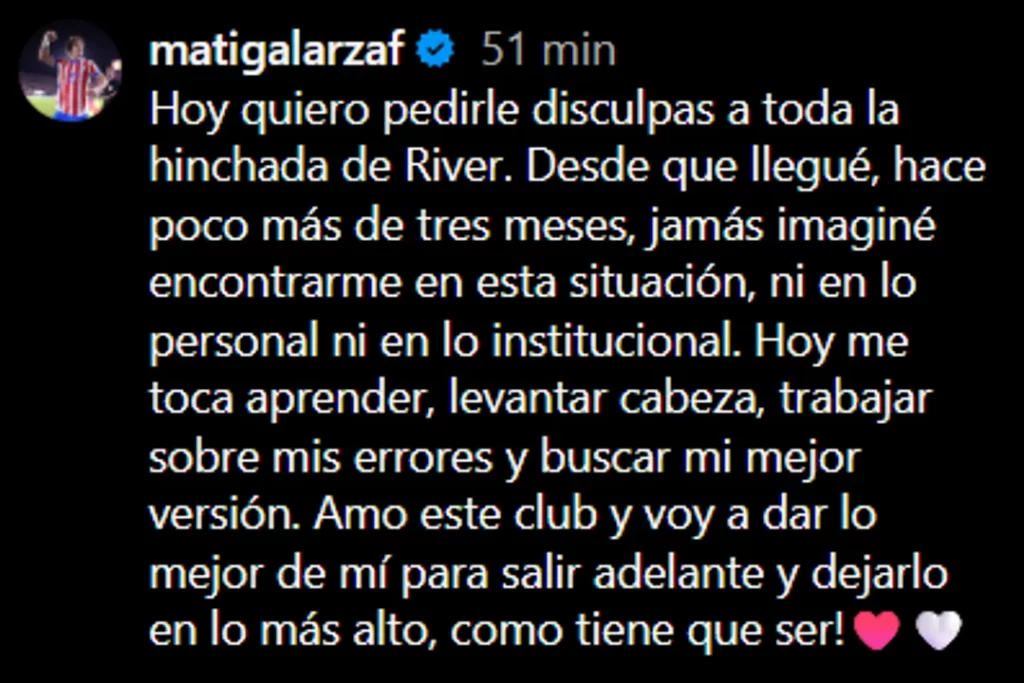 En la descripción de un posteo en blanco y negro en sus redes sociales, Galarza escribió: “Hoy quiero pedirle disculpas a toda la hinchada de River. Desde que llegué, hace poco más de tres meses, jamás imaginé encontrarme en esta situación, ni en lo personal ni en lo institucional. Hoy me toca aprender, levantar cabeza, trabajar sobre mis errores y buscar mi mejor versión”.