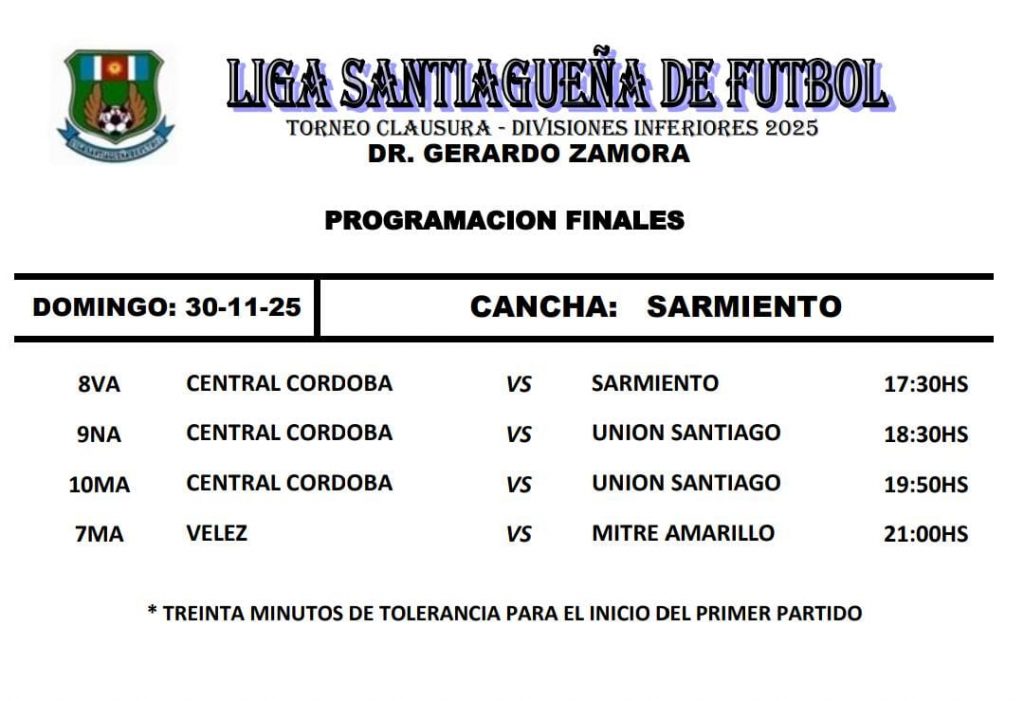 El próximo domingo 30/11 se jugarán “Las Finales” del Torneo Clausura 2025 de Divisiones Formativas, bajo organización de la Liga Santiagueña de Fútbol, y la siguiente programación: