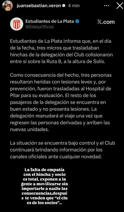 Estudiantes había publicado que “tres micros que trasladaban hinchas de la delegación del Club colisionaron entre sí sobre la Ruta 8, a la altura de Solís. Como consecuencia del hecho, tres personas resultaron heridas con lesiones leves y, por prevención, fueron trasladadas al Hospital de Pilar para su evaluación. El resto de los pasajeros de la delegación se encuentra en buen estado y no presenta lesiones. La delegación reanudará el viaje una vez que regresen las personas derivadas y arriben las nuevas unidades”.
