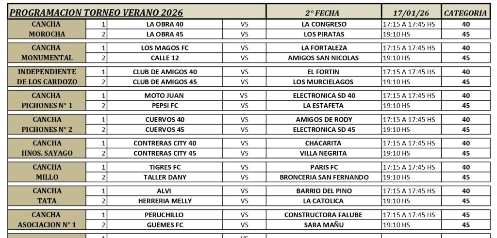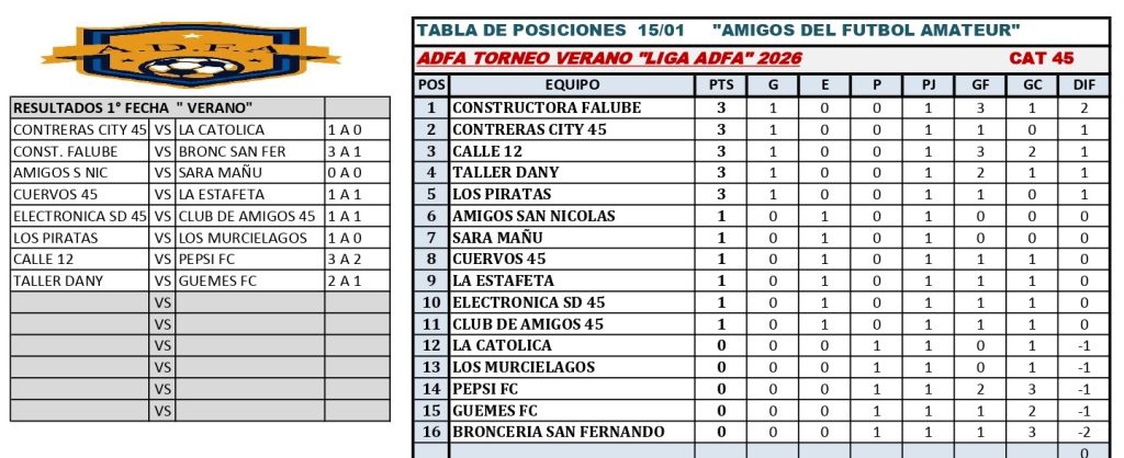 Este sábado se disputará la segunda fecha del torneo de Verano 2026 que organiza la liga Amigos del Fútbol Amateur (ADFA). En uno de los partidos atractivos, el conjunto de Alvi irá en busca de la recuperación ante barrio Del Pino en la categoría 40, tras su derrota en el arranque del torneo a manos de Moto Juan.