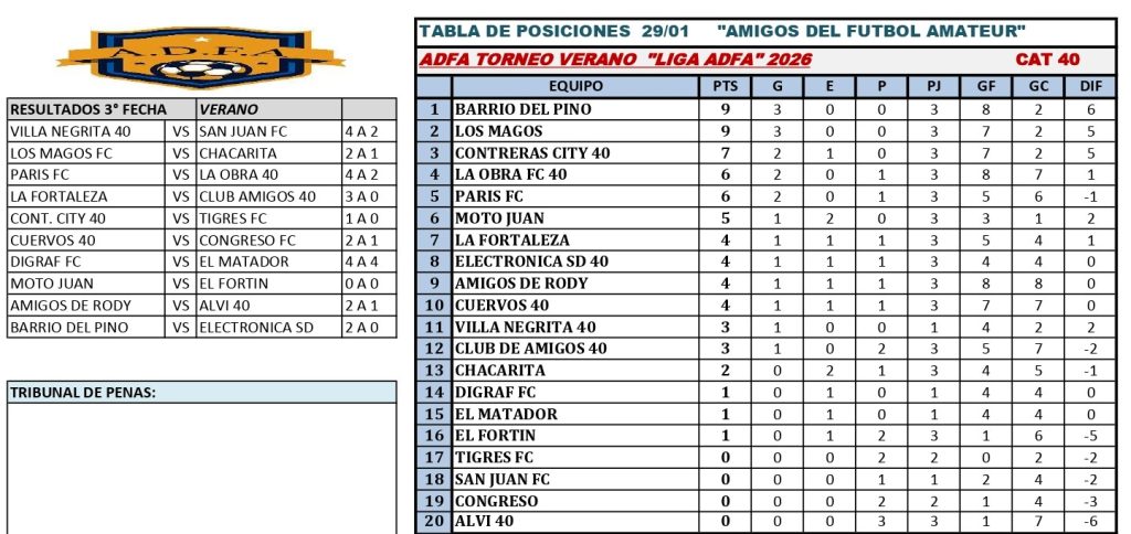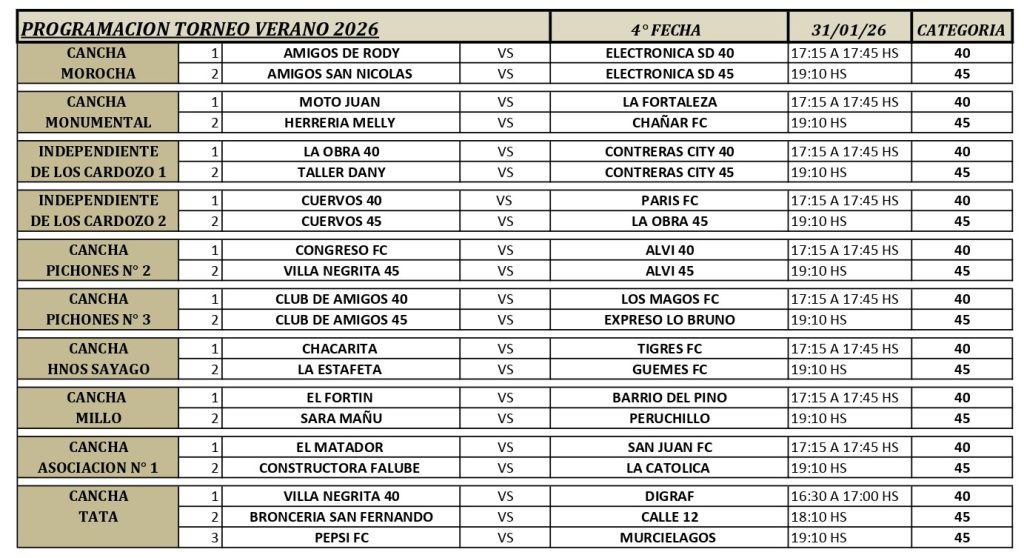 Este sábado se disputará la 4ta fecha del torneo de Verano 2026 que organiza la liga Amigos del Fútbol Amateur (ADFA) en sus dos categorías.