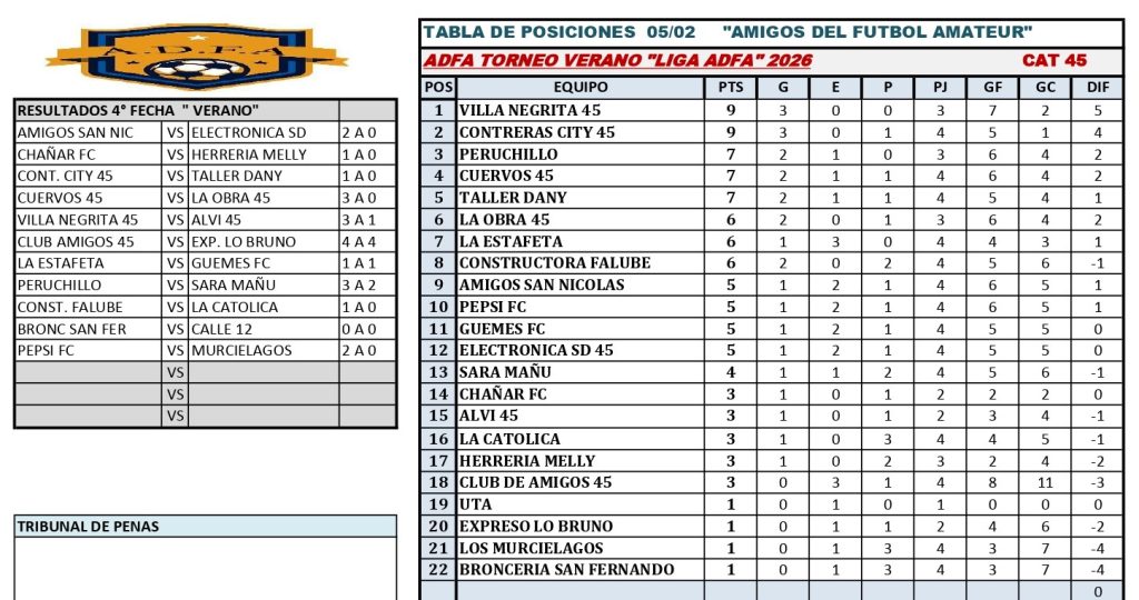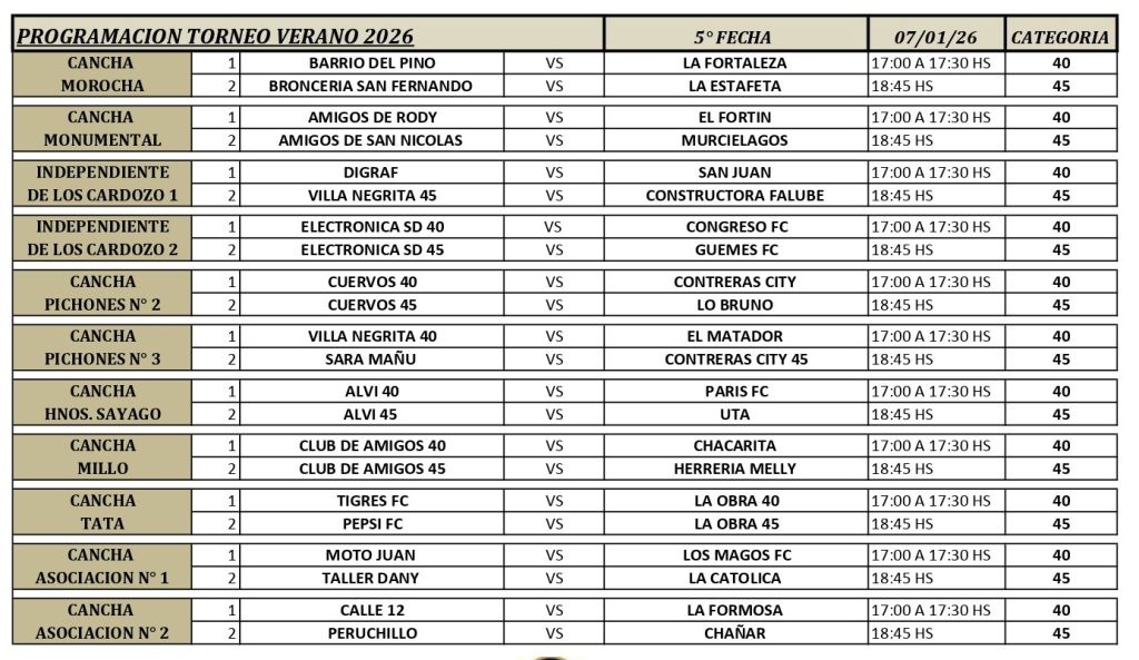 Este sábado se disputará la quinta fecha del torneo de Verano 2026 que organiza la liga Amigos del Fútbol Amateur (ADFA) en sus dos categorías con la siguiente programación: