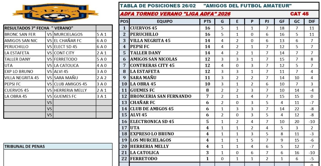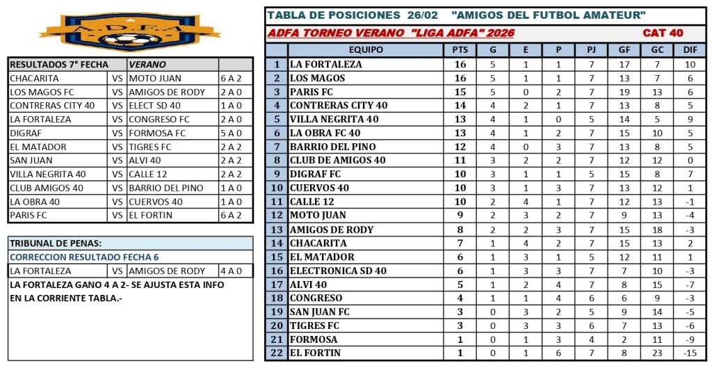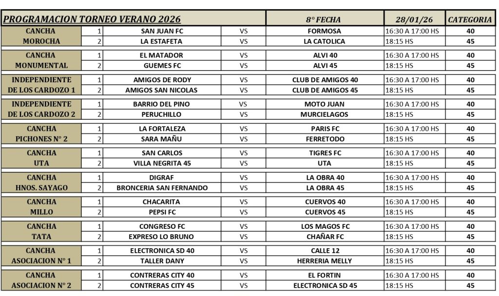 Este sábado se jugará la 8va fecha del torneo de Verano 2026 que organiza la liga Amigos del Fútbol Amateur (ADFA) con duelos más que interesantes con la siguiente programación: