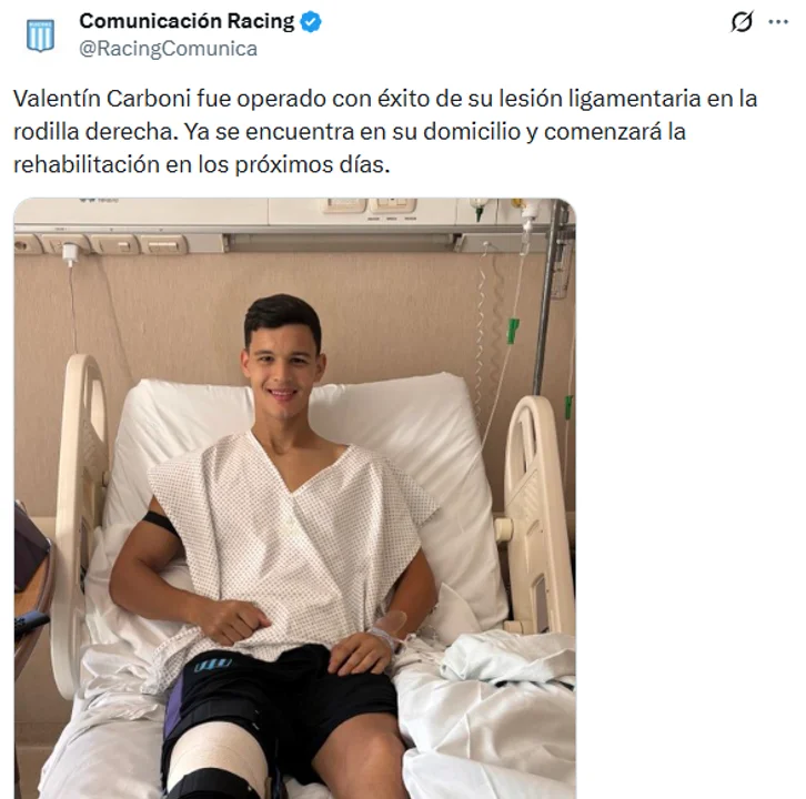 En las últimas horas, el club de Avellaneda comunicó que el futbolista, cuya ficha pertenece al Inter de Milán, fue operado con éxito de dicha lesión: “Valentín Carboni fue operado con éxito de su lesión ligamentaria en la rodilla derecha. Ya se encuentra en su domicilio y comenzará la rehabilitación en los próximos días. A meterle con todo, Valen”.