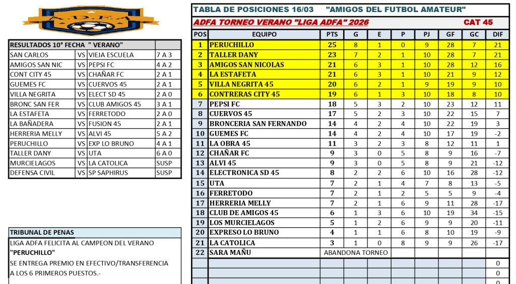 El torneo de Verano 2026 de la liga Amigos del Fútbol Amateur llegó a su fin. El pasado sábado se jugó la última fecha consagrándose campeones los equipos de La Fortaleza en la C40 y Peruchillo en la C45.