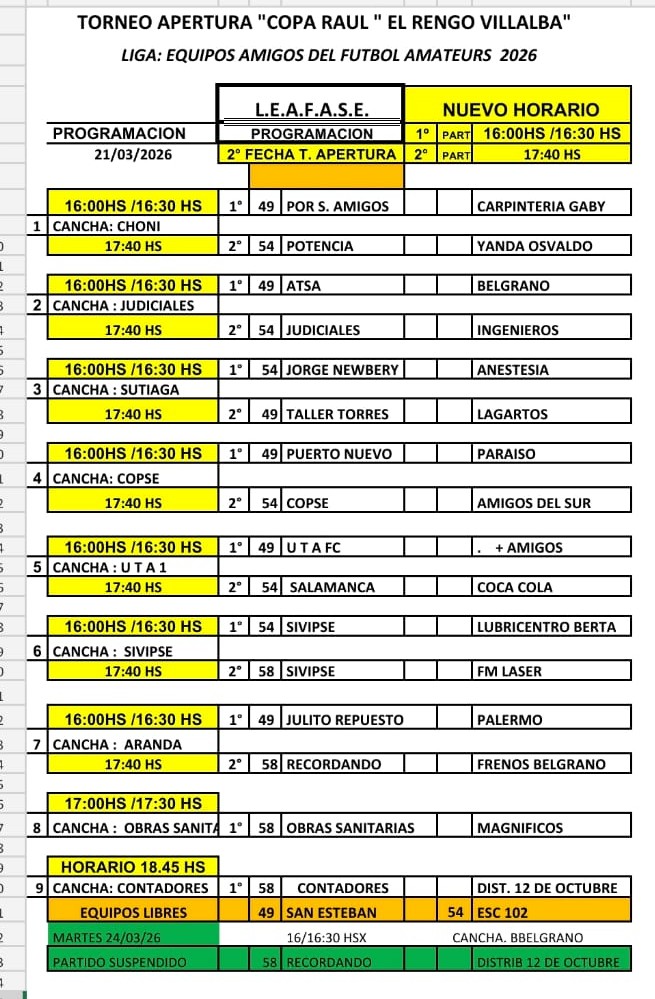 Este sábado se disputará la segunda fecha del torneo Apertura que organiza la liga Leafase en sus tres categorías con duelos más que prometedores con el siguiente programa: