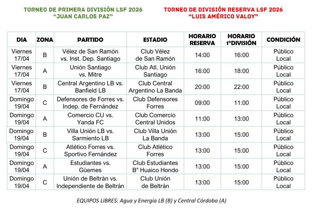 La mesa directiva de la Liga Santiagueña de Fútbol programó la segunda fecha del torneo Apertura que lleva la denominación de “Luis Américo Valoy” en Reserva y “Juan Carlos Paz” en Primera División con la siguiente programación: