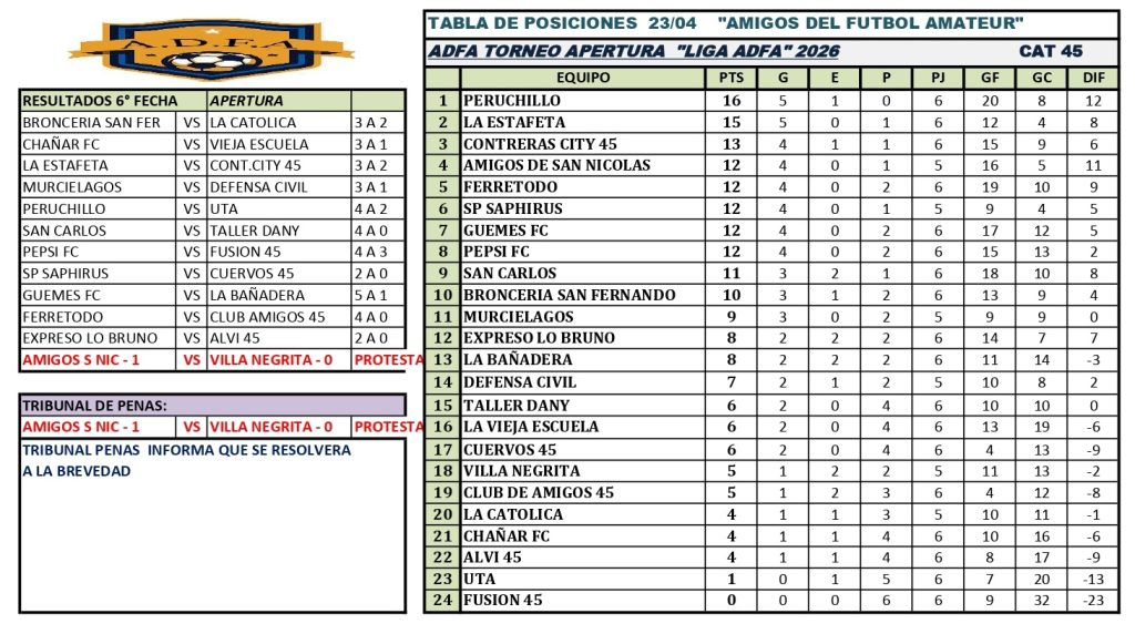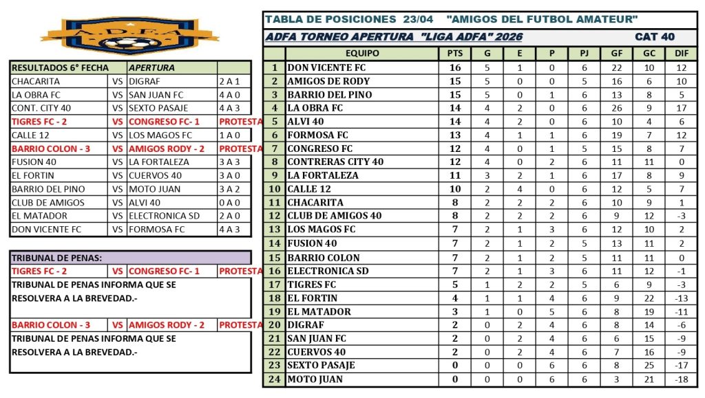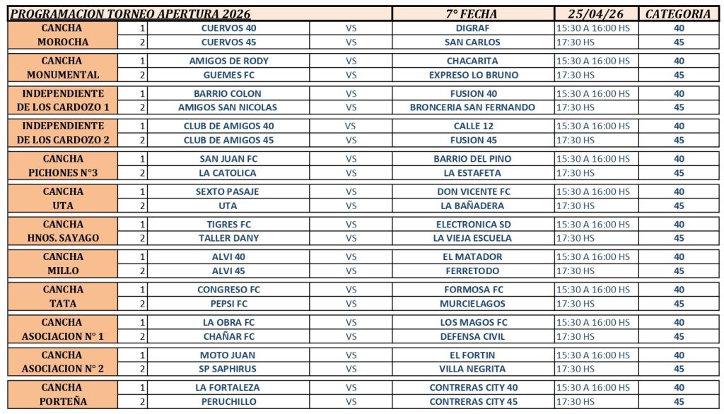 Este sábado se disputará la 7ma fecha del torneo Apertura 2026 de la liga Amigos del Fútbol Amateur (ADFA) con duelos imperdibles en sus dos categorías.
