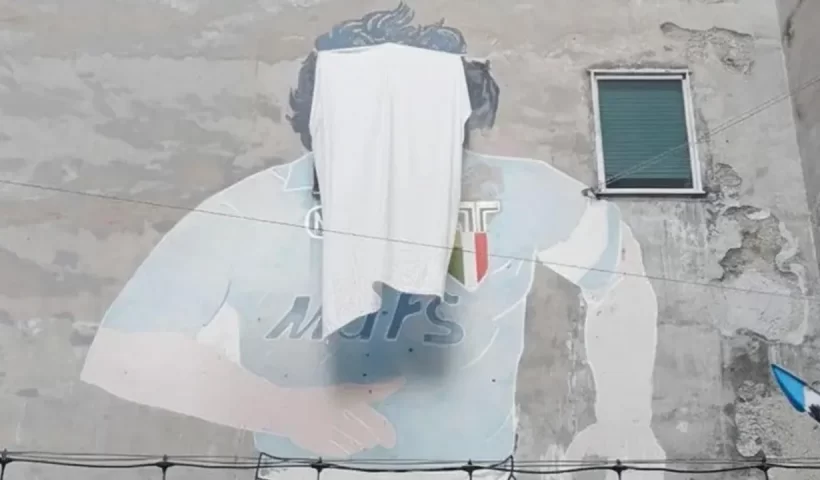 Comerciantes taparon la cara de Maradona en el famoso mural de Nápoles